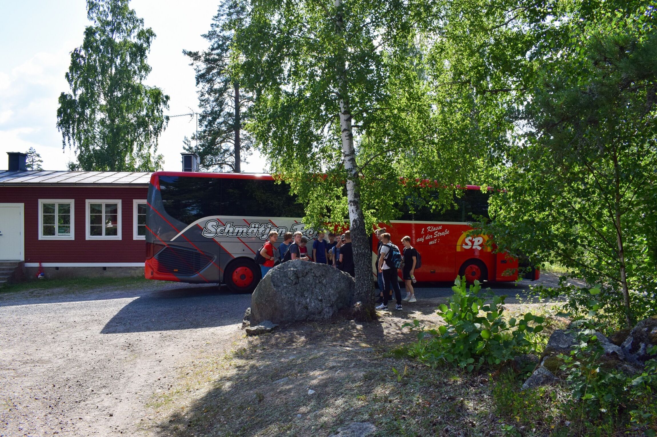 Endlich, nach über 10 Stunden Busfahrt kommen wir in Schweden, auf dem Freizeithof Sommarhagen, an. Trotz den Strapazen der langen Reise ist die Stimmung in der Gruppe hervorragend. Das Gelände ist sehr weitläufig. Neben einem Fußball- und Volleyballfeld gibt es die herrliche Natur Schwedens zu bestaunen. Das Highlight bleibt allerdings der See mit Badeinsel, der nur unweit vom Haus entfernt liegt und natürlich sofort ausprobiert wird. Auch die geräumigen Zimmer mit eigenem Bad finden großen Anklang bei den Teilnehmern. Und nicht nur im Kreis der Jugendlichen herrscht Zufriedenheit. Das Betreuerteam ist ebenfalls begeistert, denn die Freizeitgruppe entpuppt sich als äußerst angenehm, man möchte sagen "pflegeleicht". Einzig die vorherrschende Müdigkeit trübt die Stimmung, weshalb nach einer kurzen Andacht schnell Ruhe in den Zimmern einkehrt. Der erste Tag ist somit geschafft, und mit einer wohlverdienten Mütze Schlaf kann das Abenteuer richtig los gehen.
