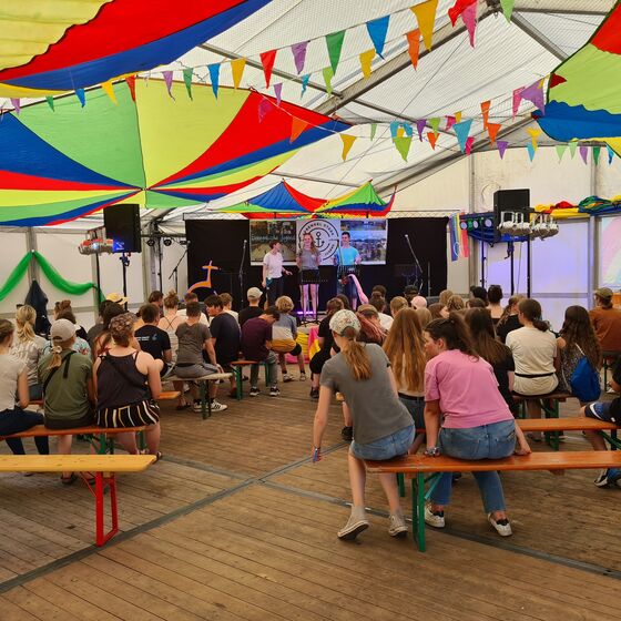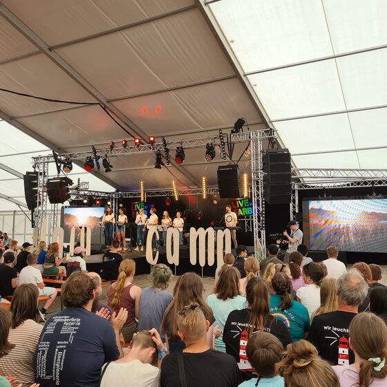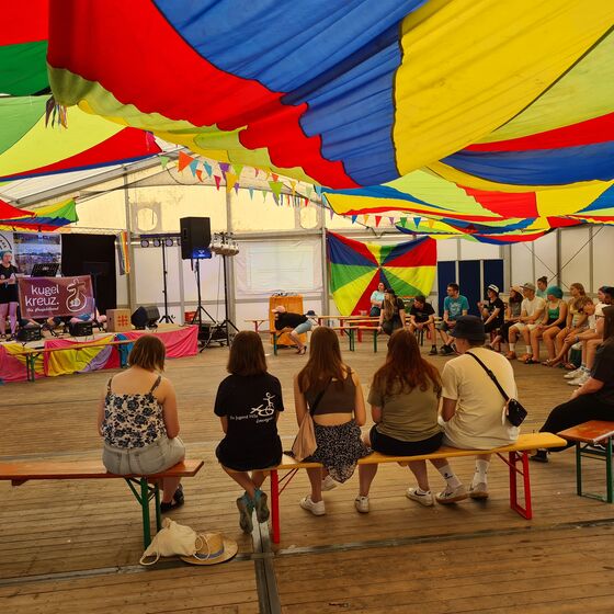 Dann ging es zum Frühstück. Jede*r mit seinem eigenen individuellen Campinggeschirr. Nach dem Frühstück ging es los zu den Waschstraßen. Wenn mehrere hundert Menschen ihr Geschirr abwaschen, dauert das manchmal ein bisschen. Währenddessen starteten schon die ersten Programme in den Sprengeln. Tagessegen und kleine Andachten, kleine Stationen, bei denen man immer so vorbeischauen konnte oder richtige Programmpunkte für die auf der großen “Campstraße” sogar geworben wurde.
