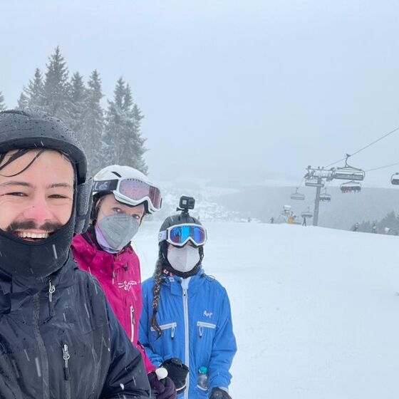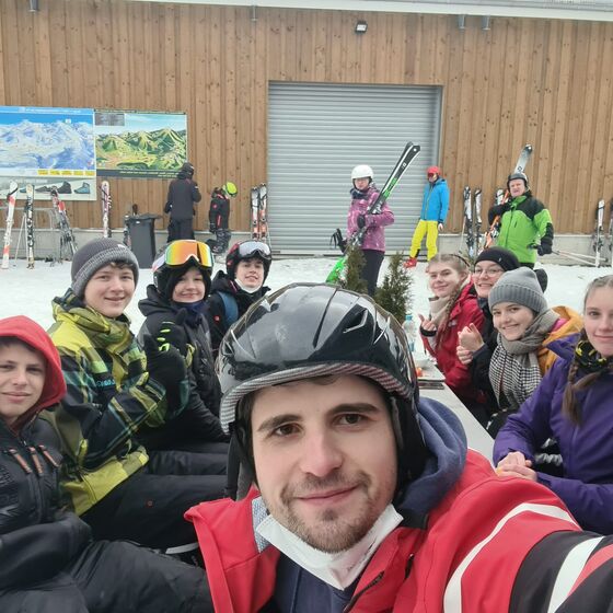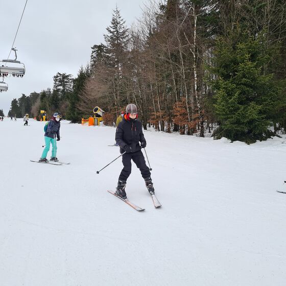 Direkt nach dem Frühstück fuhren wir zum Winterberg und wir hatten tatsächlich Glück. Nach einem anstrengenden Weg bergauf, vollbepackt mit unserer Skiausrüstung, erreichten wir endlich die Piste und es konnte losgehen. Während die Anfänger zusammen mit den beiden Skilehrer*innen am Übungshügel blieben, fuhren wir anderen zu den ersten blauen Pisten. Auch wenn das Wetter feucht und nebelig war, störte es uns überhaupt nicht dabei den ganzen Tag auf den Pisten zu verbringen. Bis zur Schließung der Lifte hatten wir großen Spaß daran durch den Schnee zu jagen.